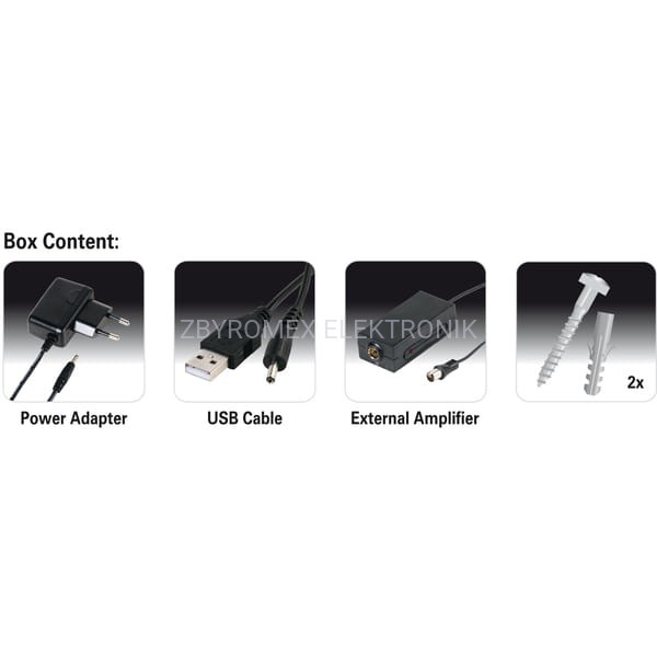 • W zestawie zasilacz, kabel koncentryczny 2m, kabel USB 1m, wzmacniacz zewnętrznym
