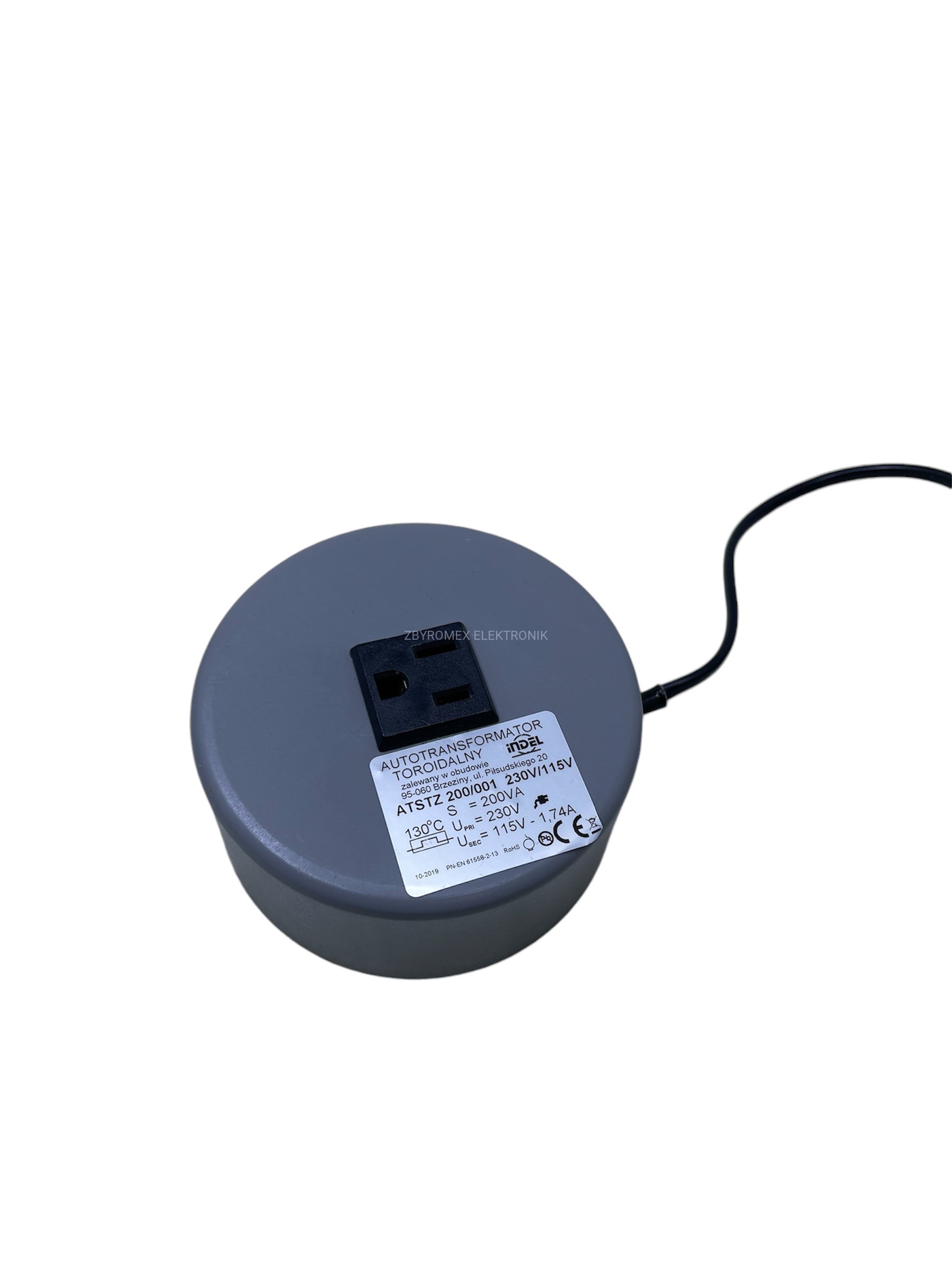 Autotransformator 230V/115V 100W zalany żywicą w obudowie z zabezpieczeniem termicznym wielokrotnym powracalnym.
