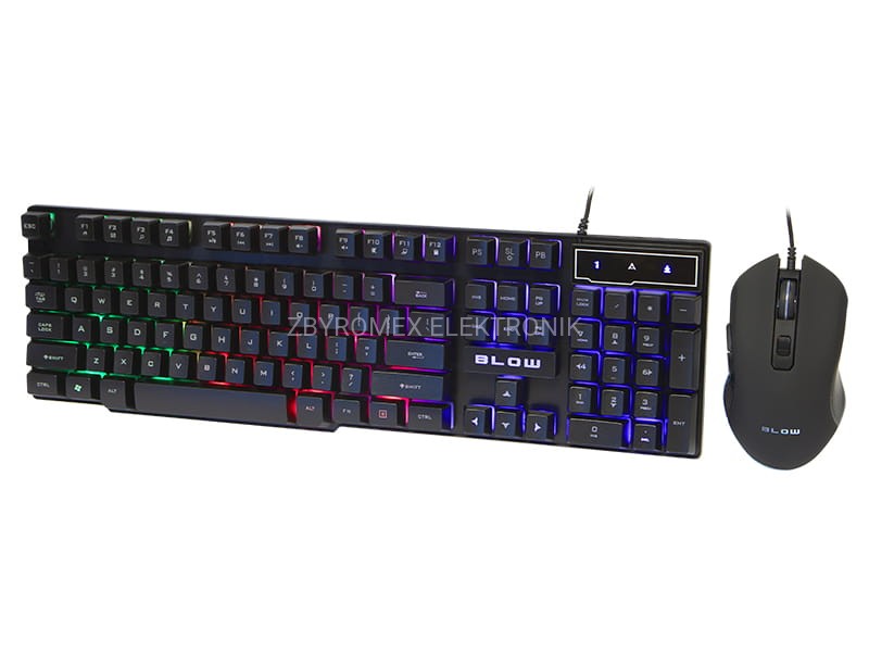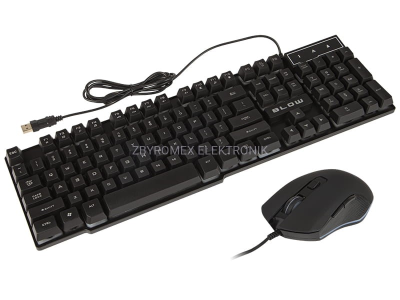 Zestaw marki BLOW składający się z podświetlanej klawiatury oraz myszki z 5 przyciskami i rolką. Obydwa urządzenia łączą się za pomocą interfejsu USB, a przewód każdego z nich ma ok. 1,5m długości. Zestaw przeznaczony głównie dla graczy którzy cenią sobie prostotę w połączeniu z nowoczesnością oraz bardzo eleganckie podświetlenie LED.