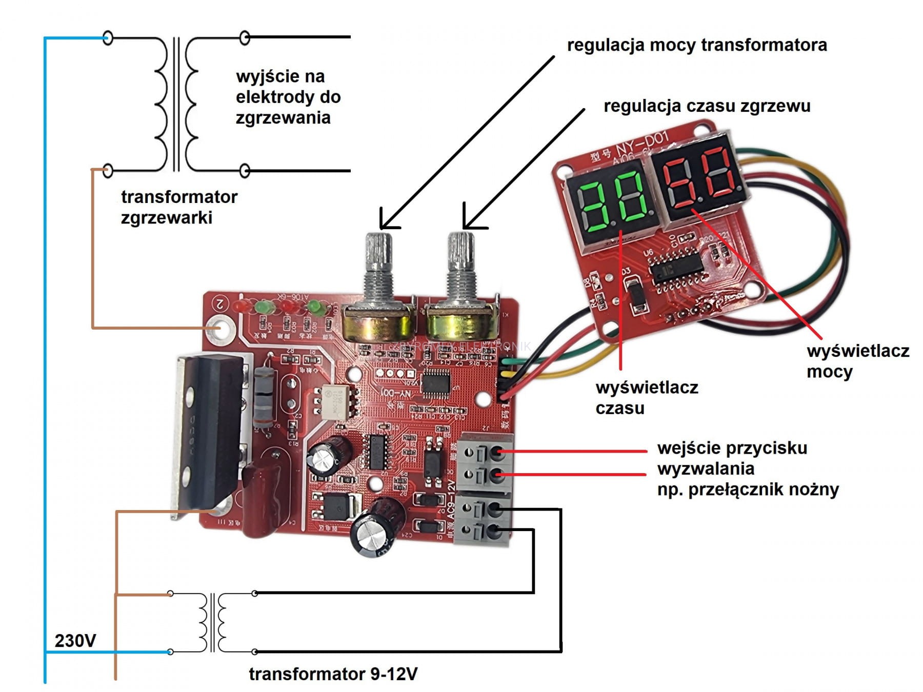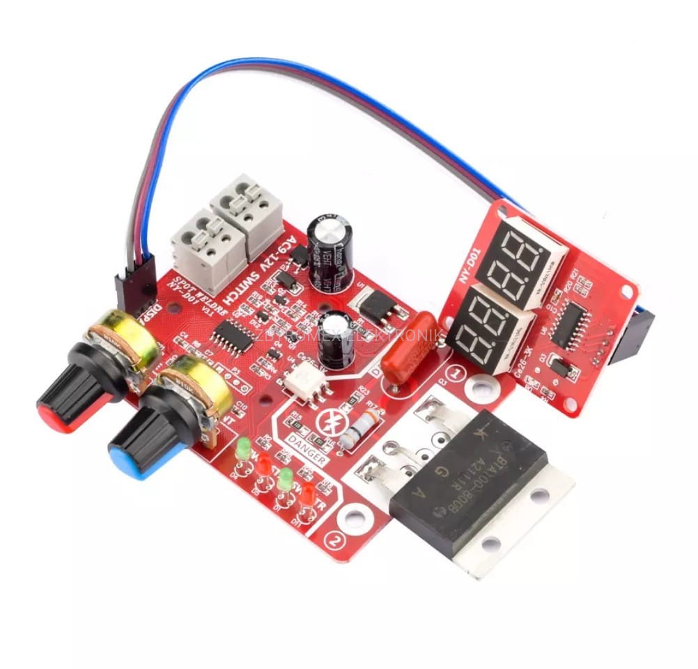 Za pomocą modułu możemy regulować czas zgrzewu od 0.02 do 1 sekundy oraz moc transformatora od 30% DO 100%. Układ został wyposażony w 2 wyświetlacze: