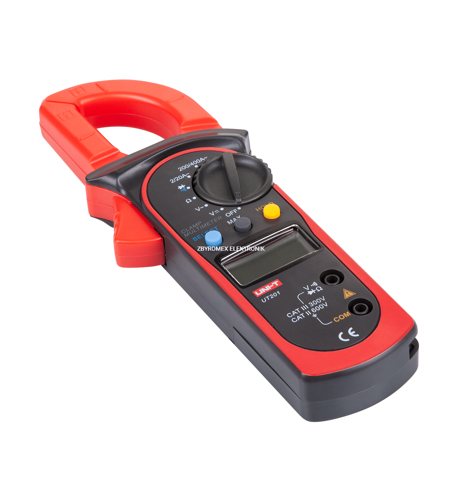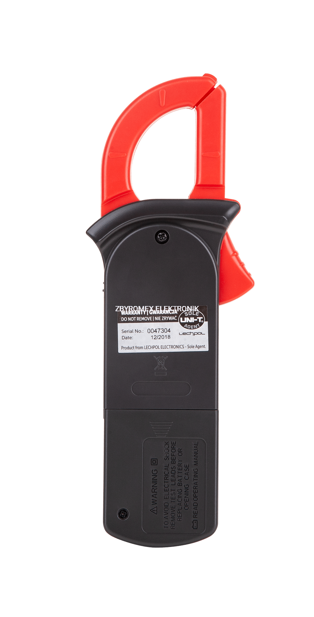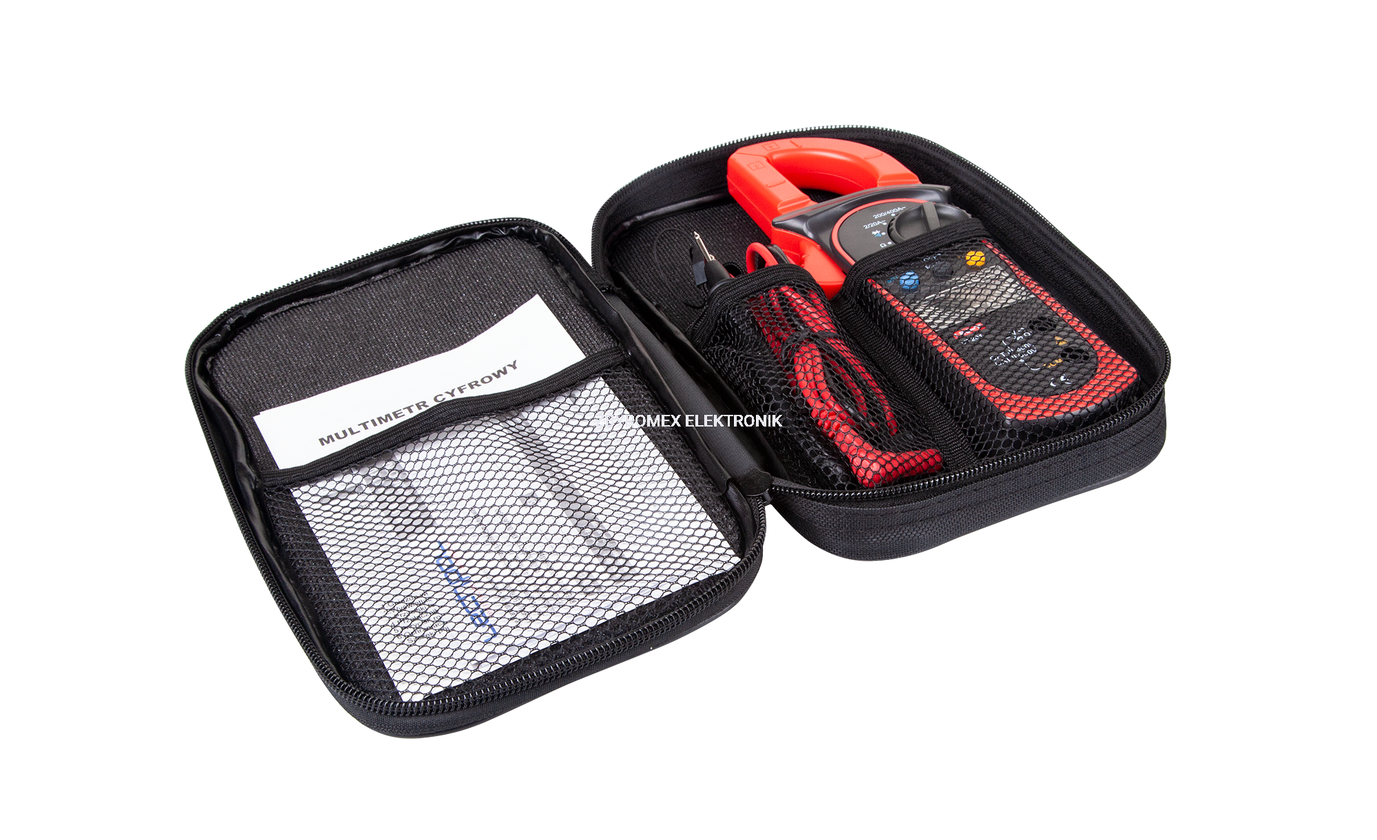 CECHY OGÓLNE Impedancja wejściowa napięcia stałego: ok. 10 MOhm Liczba pomiarów: ok. 3/s Zasilanie: Bateria 2x 1,5 V (R03) Maksymalna rozwartość szczęk: 28 mm Wyświetlacz: 35,6 x 18 mm Waga netto: 220 g Wymiary: 210 x 75,6 x 30 mm W zestawie: baterie, kable pomiarowe, etui