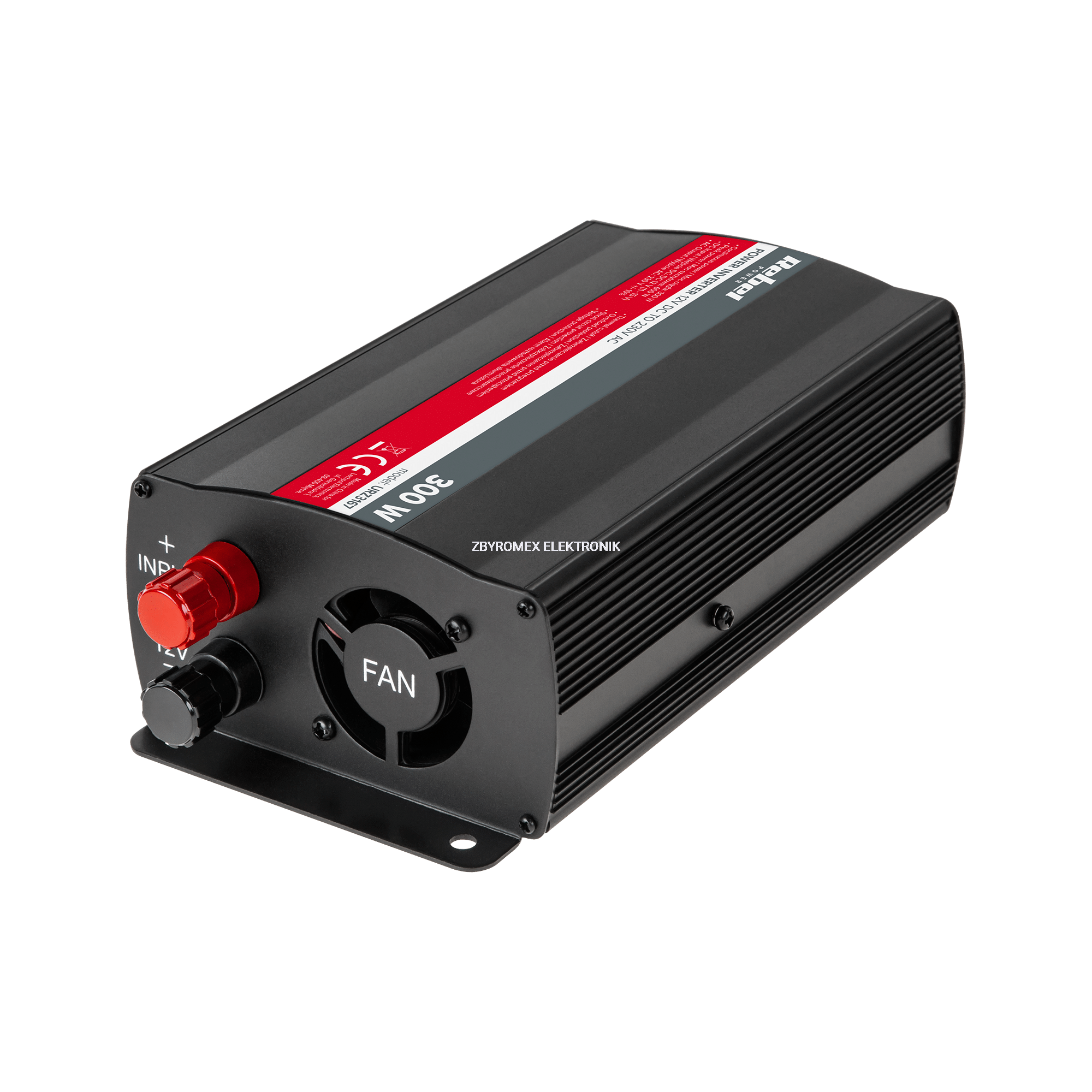 Moc wyjściowa: 300 V Chwilowa moc wyjściowa: 600 W Zasilanie: 12 V (10-15 V) Wyjście: 230 V AC 50 Hz Gniazdo typu francuskiego Zabezpieczenia:Zabezpieczenie przed przegrzaniem, przeciążeniem, przeciwzwarciowe, alarm rozładowania akumulatora W zestawie: Przewody połączeniowe z krokodylkami i wtykiem do gniazda zapalniczki