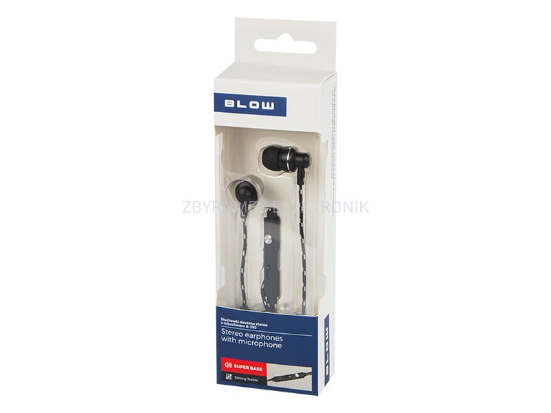 Słuchawki douszne BLOW serii B-100 wykonano z największa starannością o szczegóły. Słuchawki B-100 są wyjątkowo odporne na uszkodzenia mechaniczne. Elementy obudowy słuchawek i złącza Jack zostały wykonane z metalu a przewód znajduje się w osłonie nylonowej, przez co stał się bardziej odporny na rozciąganie i plątanie. Słuchawki wyposażono w pozłacany Jack, regulację głośności, mikrofon, przycisk uniwersalny i funkcję zestawu słuchawkowego do rozmów telefonicznych.