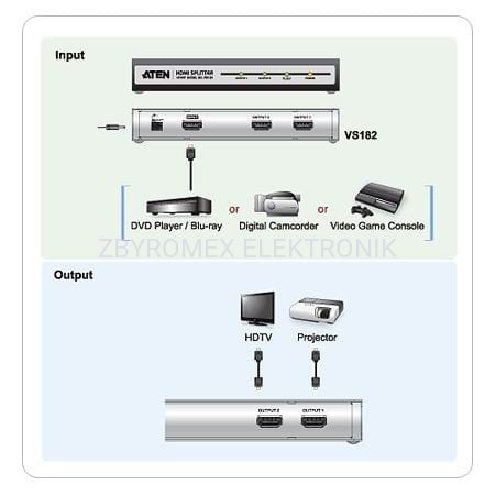 Video Splitter HDMI 2 portowy służy do podłączenia źródła sygnału video (tuner satelitarny, odtwarzacz DVD, kamera cyfrowa, konsola do gier itp) do dwóch monitorów, zestawu kina domowego lub projektorów w standardzie HDMI. Sygnał odtwarzany jest na obu odbiornikach jednocześnie.