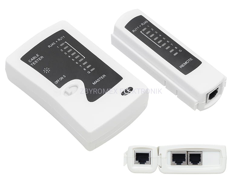 Tester do kabli RJ45 oraz RJ11 - produkt wykrywa takie nieprawidłowości jak zwarcie, rozwarcie, zamienione żyły czy zamienione pary poprzez sygnalizację składającą się z 9 diod LED. W zestawie znajduje się jednostka główna, jednostka zdalna, etui oraz instrukcja obsługi.