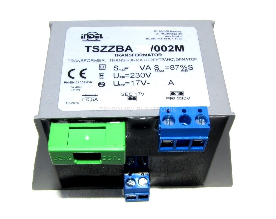 Transformator zalewany żywicą w obudowie, do systemów alarmowych, ochrony, do pracy przerywanej z bezpiecznikiem szklanym wymiennym.