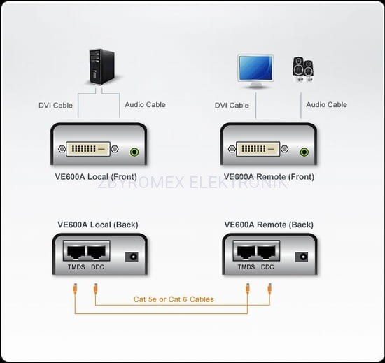 VE600A Extender pozwala na przeniesienie sygnału DVI oraz audio na odległość do 60m. Połączenie realizuje się za pomocą pary przewodów wykonanych ze skrętki 4parowej kat 5e. Zapewnia wsparcie dla popularnych formatów panoramicznych i doskonałą jakość obrazu w odległych monitorach. W komplecie znajdują się zasilacze oraz zestaw do montażu w racku 19" UWAGA ! Zestaw nie zawiera skrętkowych kabli połączeniowych