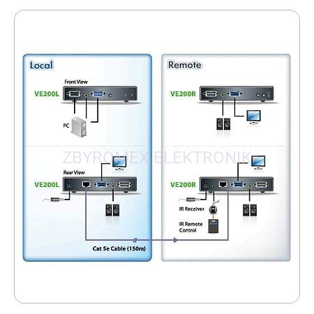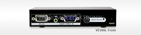 VE-200 to urządzenie pozwalajace na podłączenie do komputera dodatkowych dwóch monitorów i dwóch zestawów głosników w odległości do 150 m. VE-200 składa się z dwóch modułów: lokalnego i zdalnego połączonych za pomocą kabla typu skrętka 4parowa kat. 5e (kabel nie znajduje się w zestawie!). Extender obsługuje również port RS-232.