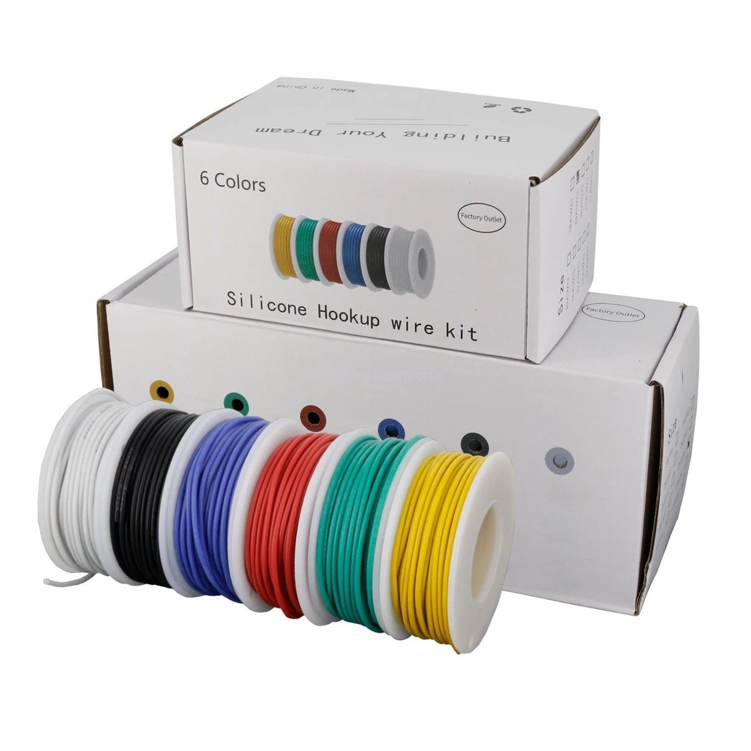 Zestaw 6szt przewodów drucianych w silikonowej izolacji. Każdy przewód nawinięty jest na szpulce dzięki czemu nie poplącze się.